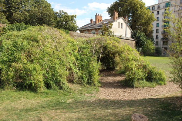 Des cabanes confectionnées avec des matériaux divers avec une certaine économie de moyens - Jardin botanique de Nantes : Tressage d’un abri avec des pieds de saules (crédit : Omnibus)