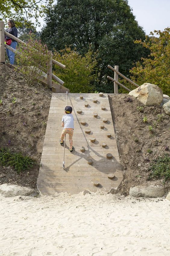 Des agrès et un revêtement au sol naturel et perméable en copeaux de bois