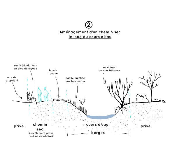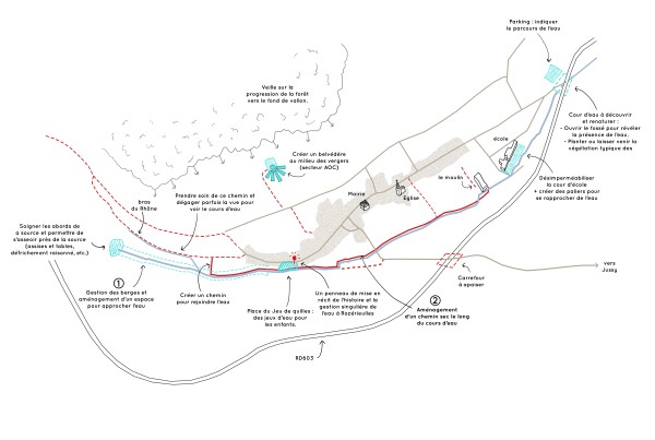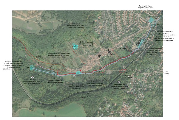 Trouver / créer de la cohérence entre les différents espaces publics qui ponctuent le trajet de la source au point bas du village, « besoin de lien le long du « Bord du Rupt » ».